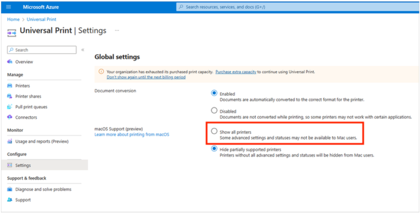 1. Configura l’impostazione Supporto macOS (preview) su “Mostra tutte le stampanti”