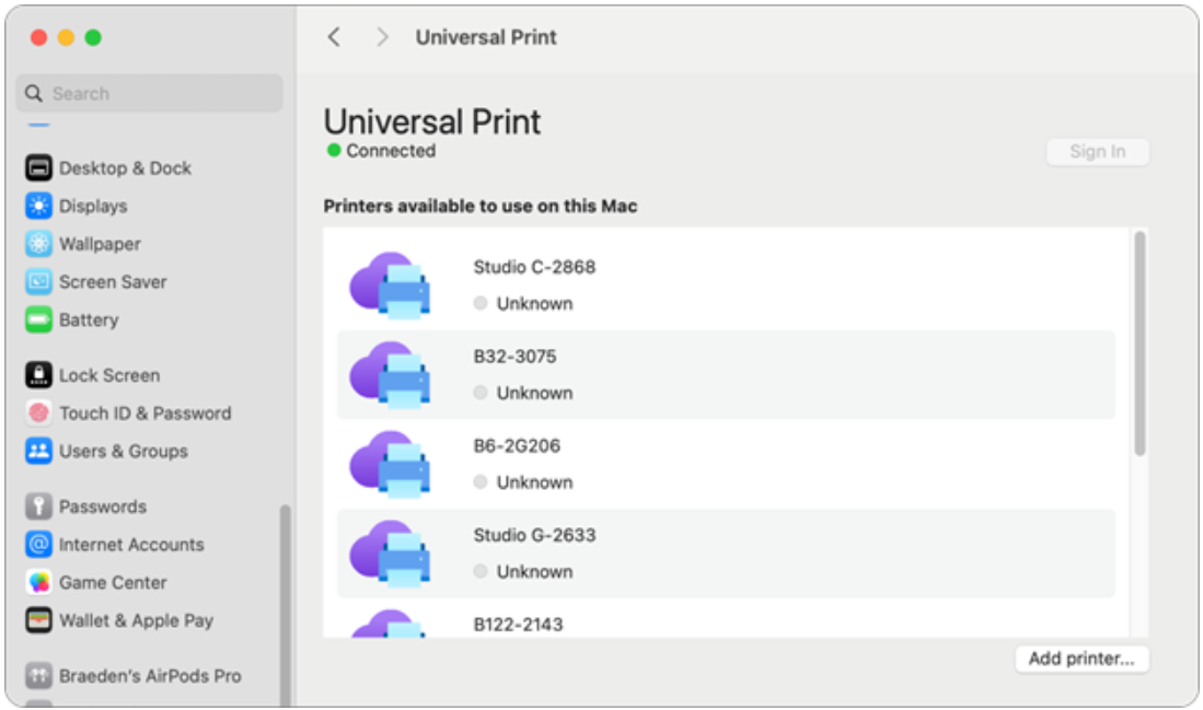 Dopo aver installato l’app Universal Print e aver effettuato l’accesso a un account Microsoft Entra ID idoneo per il servizio, gli utenti potranno cercare le stampanti per nome o anche restringere l’elenco in base alla posizione, quindi aggiungere le stampanti pertinenti ai loro dispositivi.