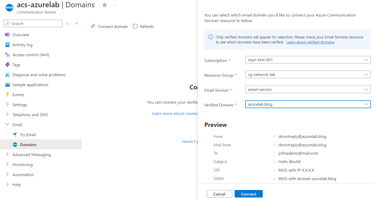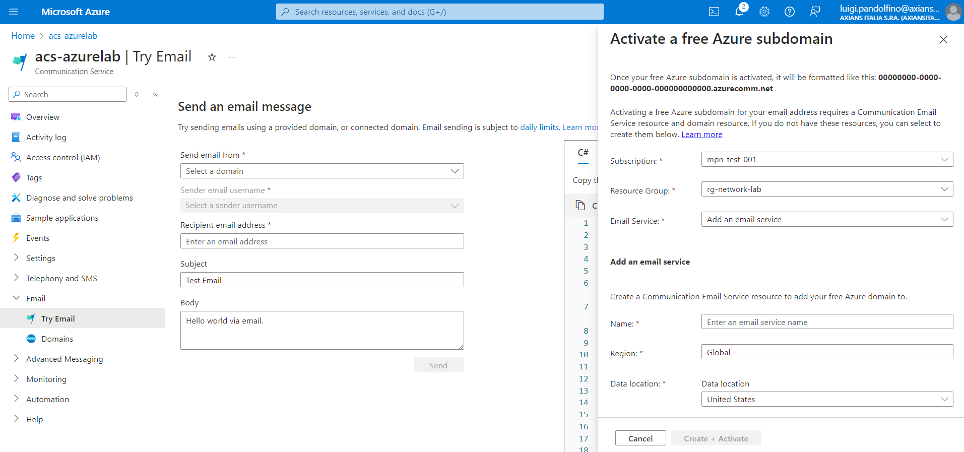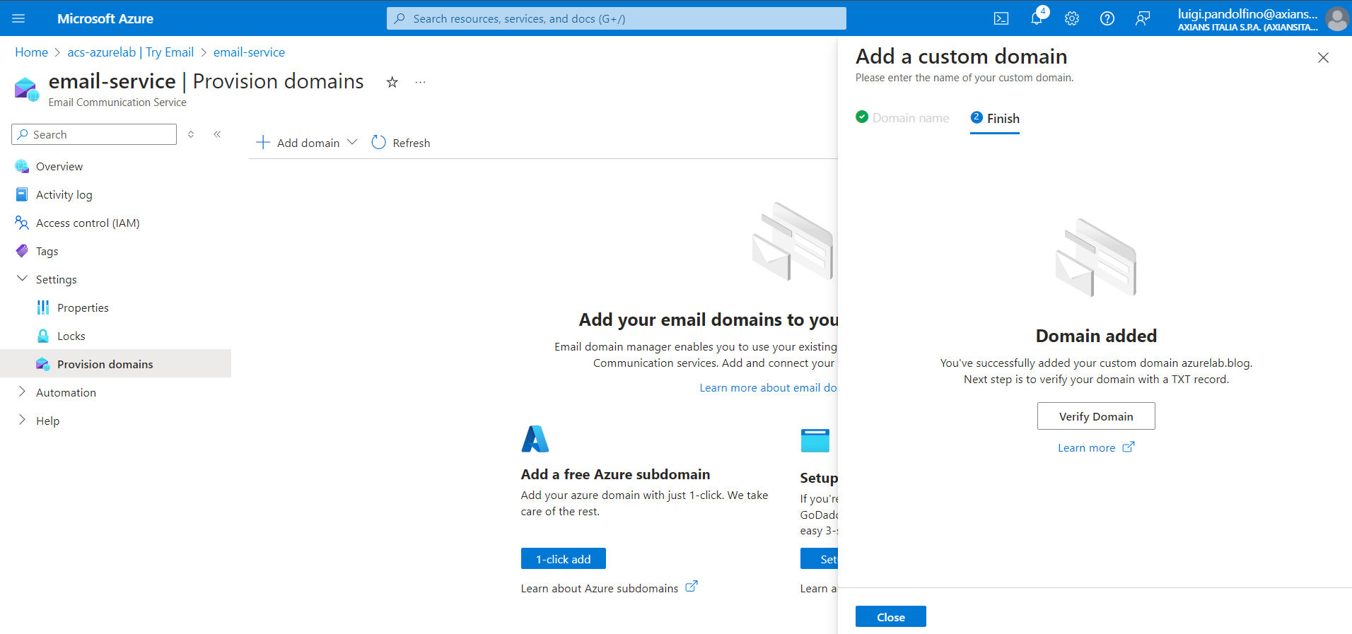 A questo punto è necessario aggiungere un dominio di invio, ci vengono fornite due possibilità: la creazione di un dominio gratuito e gestito direttamente da Microsoft (con un entry del tipo GUID.azurecomm.net), che però comporta un volume limitato di posta: