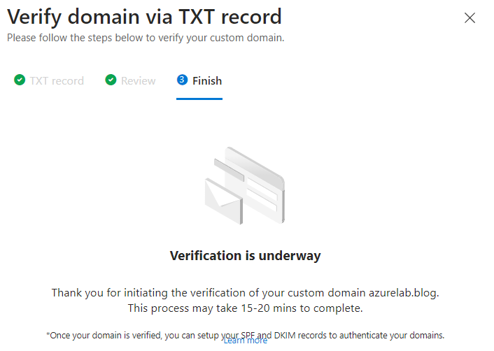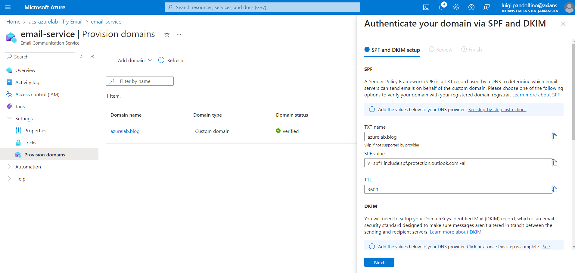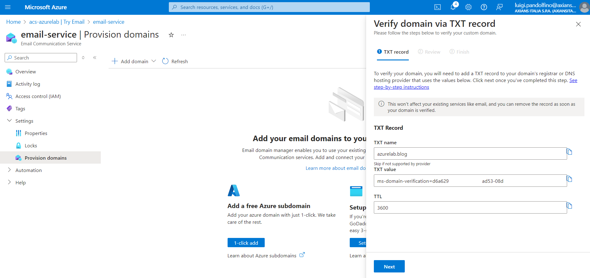 Mentre la seconda opzione, che chiaramente è quella che consiglio, è l’utilizzo di un dominio personalizzato per cui, una volta aggiunto, verrà fornito un record TXT da inserire nei sistemi del DNS provider: