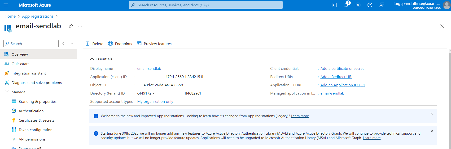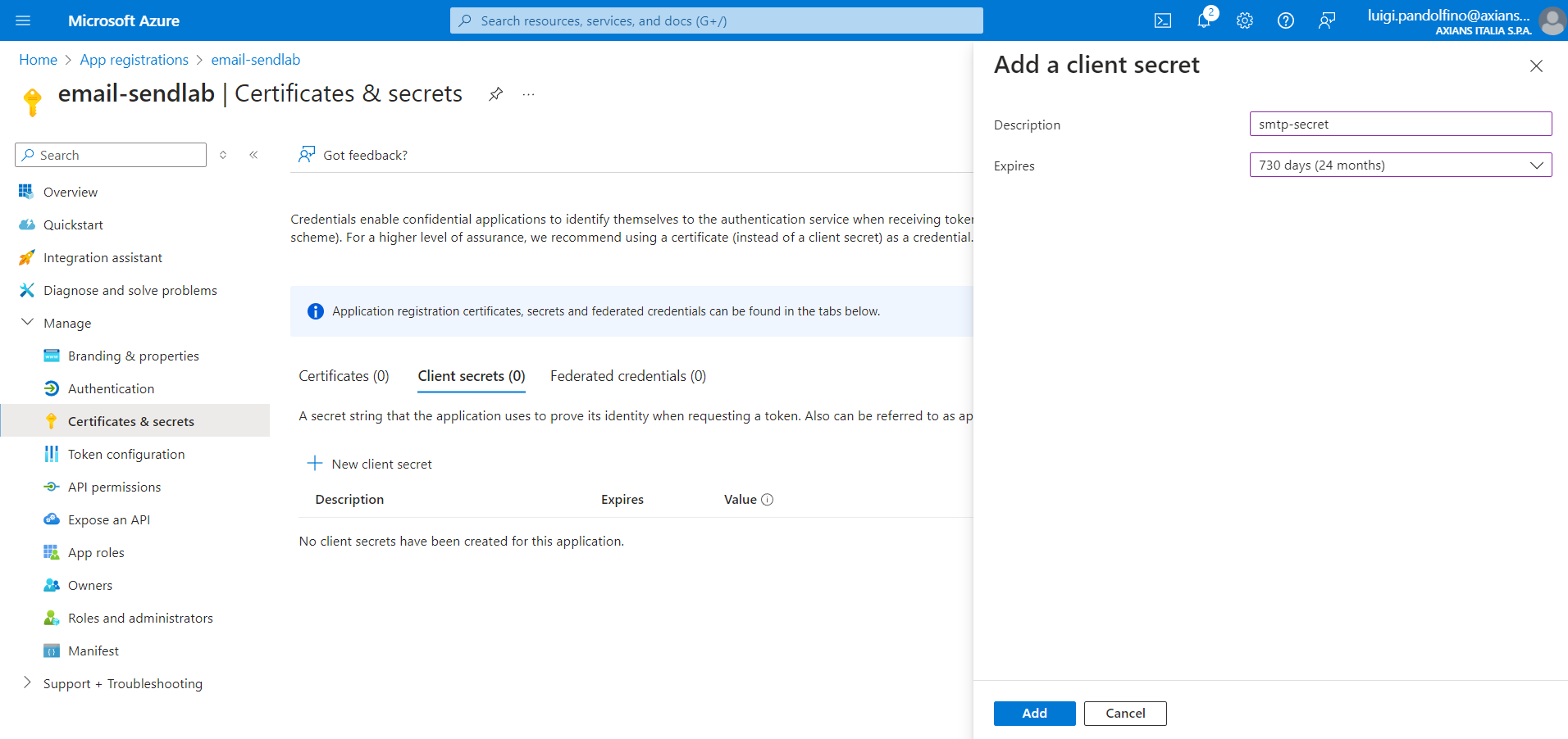 Per inviare email autenticate via SMTP si utilizzerà la porta 587. Per quanto concerne le autorizzazioni la base sarà Entra ID e dovremo eseguire una App Registration i cui valori (Application ID, Secrets, Tenant ID) ci serviranno successivamente:
