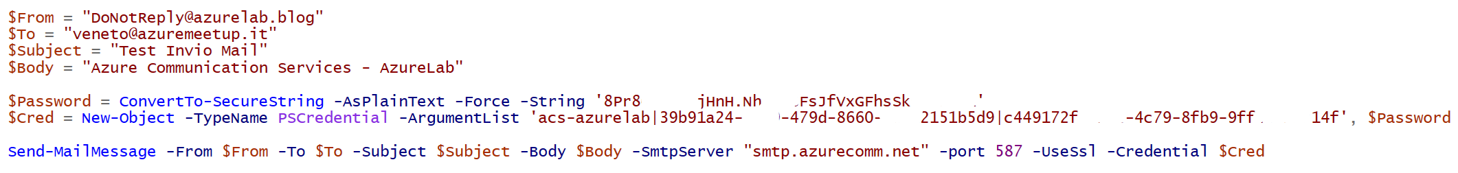 – Username: <nome risorsa Azure Communication Services>.<Application ID>.<Tenant ID>
