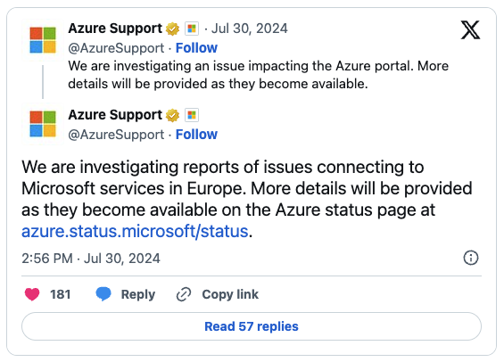 Microsoft conferma che diversi servizi come Azure App Services, Application Insights, Azure IoT Central, Azure Log Search Alerts, Azure Policy e l’interfaccia di Azure sono stati negativamente influenzati da un attacco Distributed Denial-of-Service (DDoS).