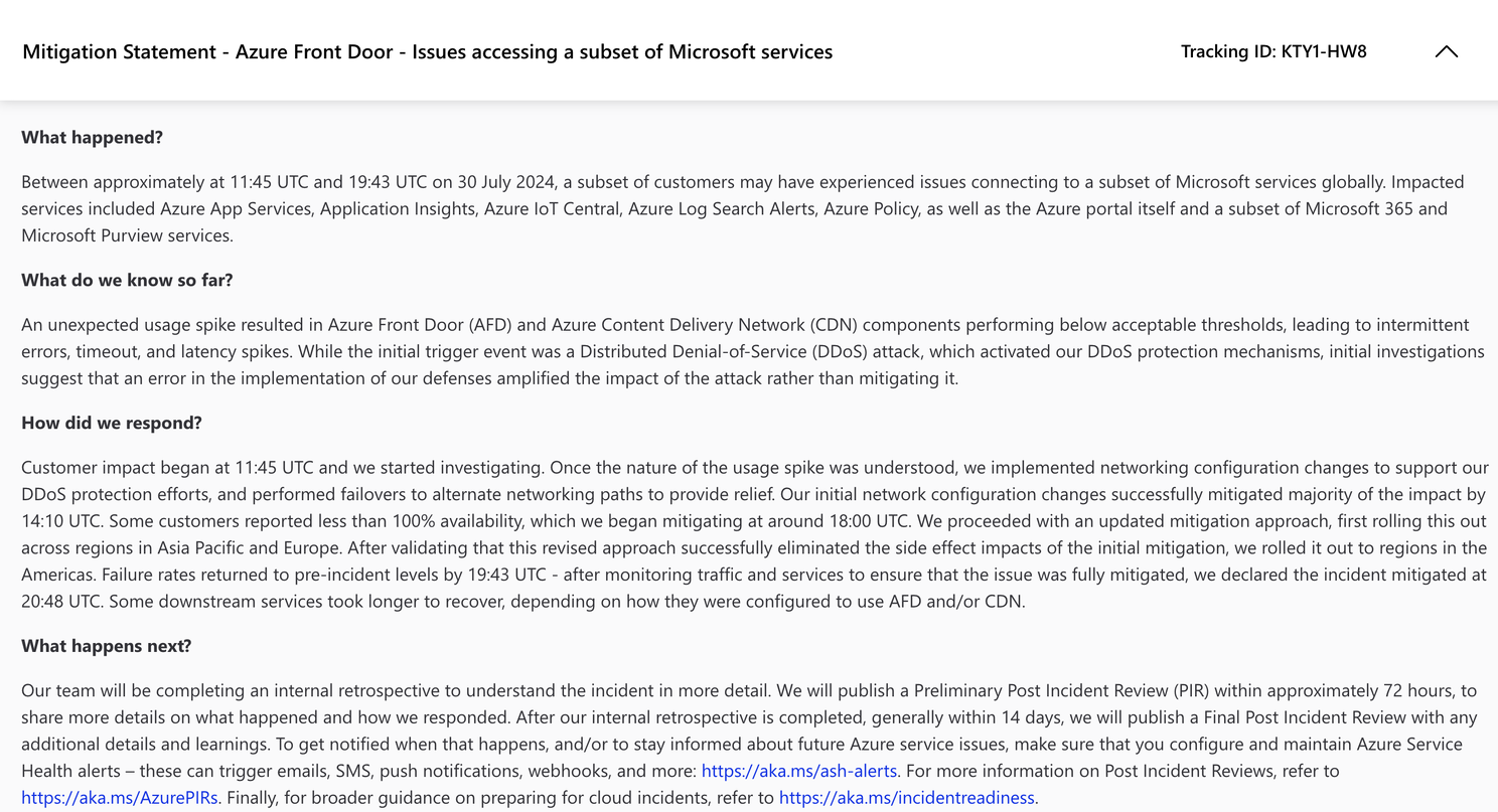 Tra le 11:45 UTC e le 19:43 UTC un picco di utilizzo imprevisto ha provocato dei malfunzionamenti di Azure Front Door (AFD) e Azure Content Delivery Network (CDN) che, a loro volta, hanno generato: