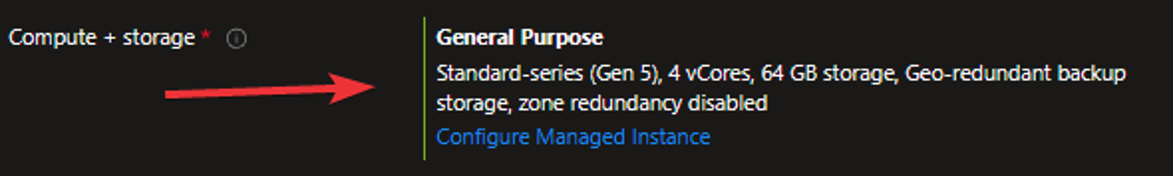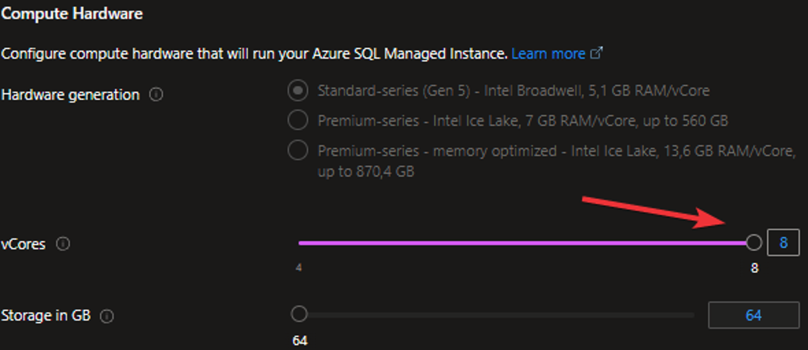 5. Dopo aver applicato l’opzione gratuita, Microsoft ci offre 4 vCore e 64 GB di spazio di archiviazione è possibile aumentare il numero di vCore a 8, come mostrato nello screenshot qui sotto: