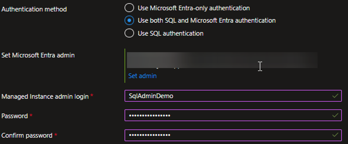 6. Decidiamo che tipo di autenticazione vogliamo usare per accedere alla nostra istanza io qui sotto ho deciso di impostare: Use both SQL and Microsoft Entra authentication: