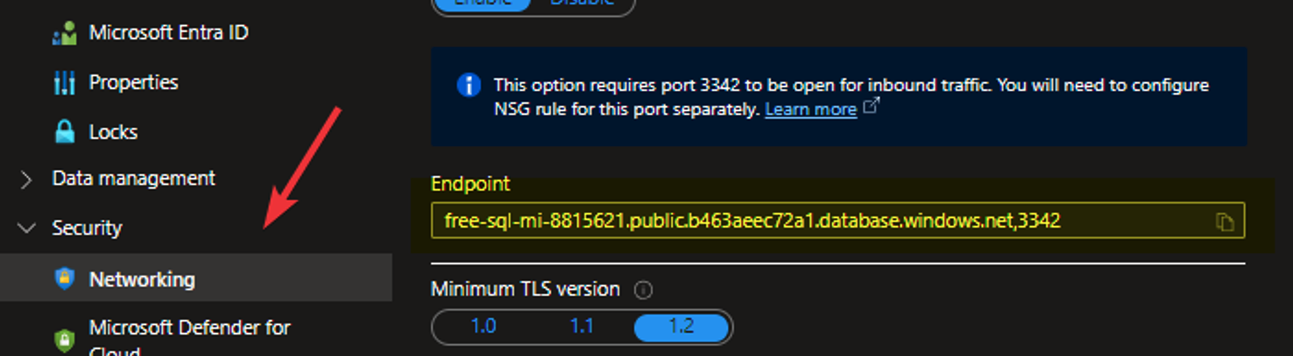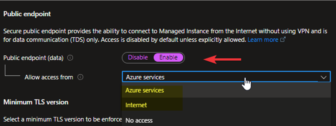 7. A questo punto ci assicuriamo che la nostra istanza gestita sia accessibile abilitando l’endpoint e definendo da dove è possibile collegarsi, come si vede qui sotto abbiamo già la possibilità di limitare l’accesso solo a servizi Azure o lasciare un accesso libero da internet:
