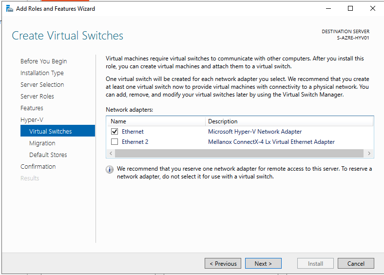 PS C:\Windows\system32> Get-NetAdapter Name InterfaceDescription ifIndex Status MacAddress LinkSpeed ---- -------------------- ------- ------ ---------- --------- Ethernet 3 Microsoft Hyper-V Network Adapter #2 14 Up 7C-1E-52-32-3C-EF 50 Gbps Ethernet 5 Mellanox ConnectX-4 Lx Virtual Eth...#3 11 Up 7C-1E-52-32-3C-EF 50 Gbps vEthernet (VM-Internal) Hyper-V Virtual Ethernet Adapter #2 2 Up 00-15-5D-01-06-09 10 Gbps