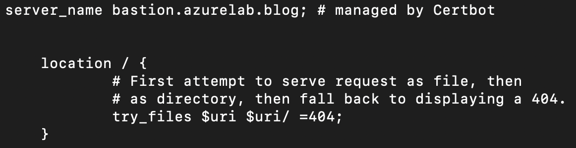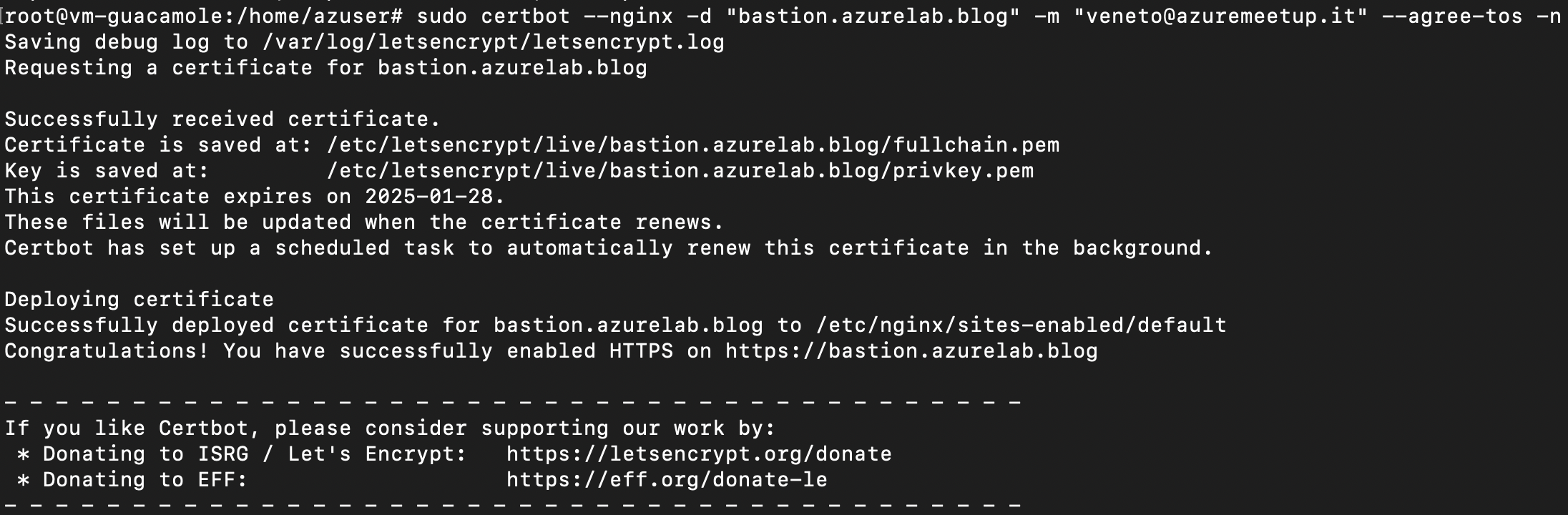 sudo certbot --nginx -d "bastion.azurelab.blog" -m "veneto@azuremeetup.it" --agree-tos -n