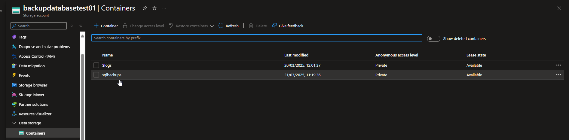 Assumiamo che tu abbia già creato uno Storage Account chiamato backupdatabasetest01.