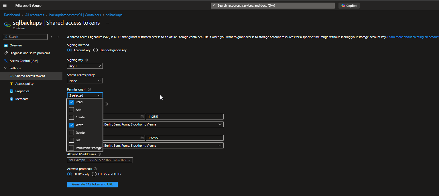 5️⃣ Copia la stringa Blob SAS URL: per SQL Server servirà solo la parte dopo ?sp=....