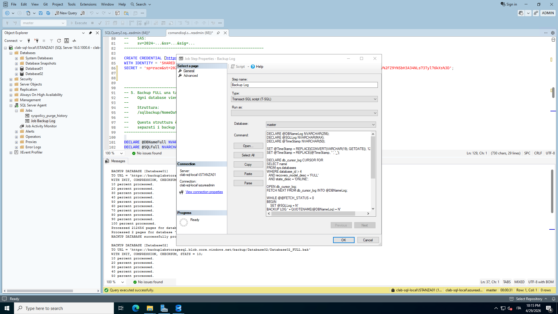 Step 4 — Configurazione dei backup dei log (SQL Server Agent Job)