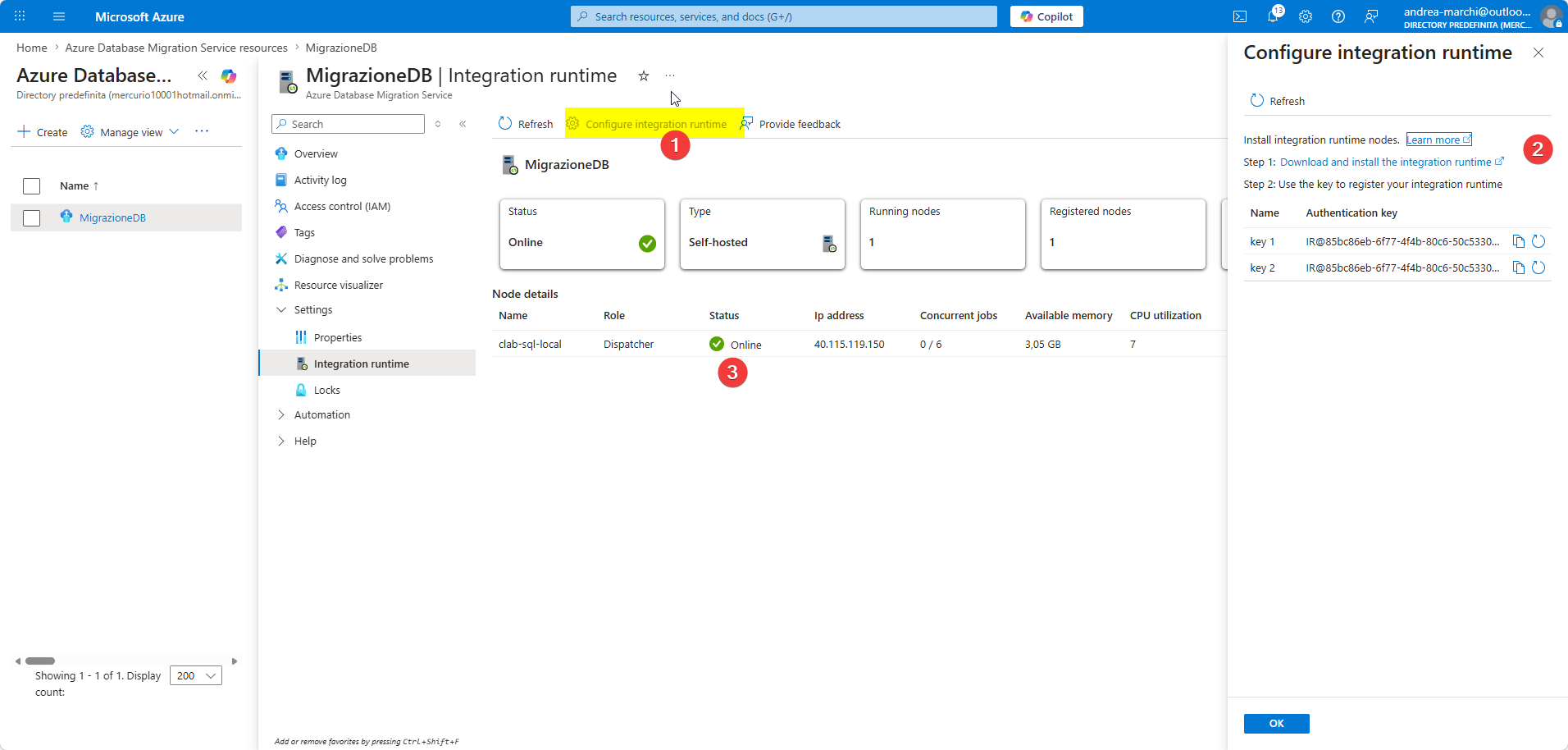 Torna nel portale Azure, nella sezione DMS → Integration Runtime.