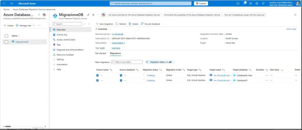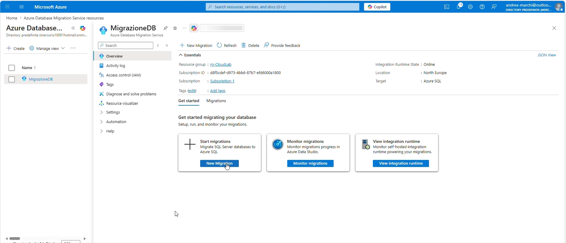 - entra nel servizio Azure Database Migration Service