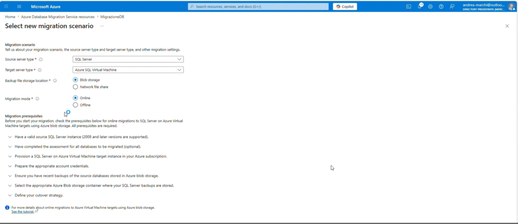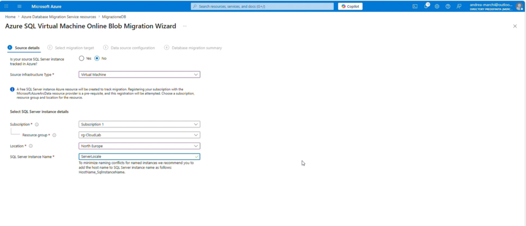 Ora possiamo configurare la migrazione vera e propria tramite il wizard di Azure DMS.
